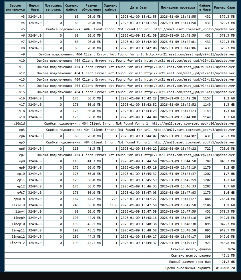 2. Генерация таблицы. Вообще, сгенерированная таблица будет в итоге очень полезна, для просмотра чего там творится в принципе на "источнике". Ей так же нужно уделить внимание. Я сделал 2 варианта для тёмной темы и для светлой, немного расширил информацию в заголовках и по мелочам адаптировал по размерам/рюшечкам.. Из-за особенности зрения у каждого человека, кто-то видит хорошо буквы на белом фоне, а кто-то на чёрном, не плохо было бы в изначальные свойства таблицы вписать выбор чёрной - 0, белой - 1 темы. Сами файлы web чуть позже добавлю. Вопрос по таблице.. немного не понял сути генерации просто таблицы и полной таблицы в html.. зачем? для чего делался? столбец "Последняя проверка" сомнителен, ибо если его публиковать в массы, сразу "палишь", помимо всего прочего, посекундный доступ твоего ip к серверам eset, считаю столбец "Дата базы" вполне достаточен, чтобы перекрыть и столбец "Последняя проверка".